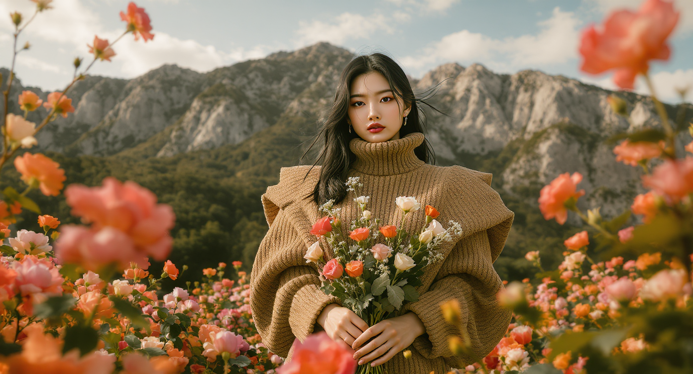 Here’s the prompt for the images below: High-fashion Vogue editorial photograph, shot from an extreme low angle through clusters of wild roses in the foreground, with blurred stems and petals framing the lens in an artistic composition. A stunning South Korean woman in her mid-20s stands gracefully against the backdrop of a sweeping mountain range, long black hair tousled by the breeze, soft strands falling across her luminous forehead. She wears a voluminous, oversized earth-toned ruffled sweater styled as a statement piece blending grounded natural hues with bold modern fashion. In her hands, she holds a bouquet of wild roses, the florals echoing the rugged beauty of the landscape around her. The mountains stretch out in the background--majestic ridges washed in muted browns, soft greens, and sunlit stone. Lighting is natural but styled to feel editorial: warm daylight softened by foreground blooms, producing organic flares, earthy haze, and sculpted shadows that flatter her figure. The image feels intentional and artistic, with elegant framing, crisp details, and painterly tones. A dreamy yet sophisticated visual, balancing the raw power of nature with couture styling. Captured on Leica SL2 + APO-Summicron-SL 90mm f/2, ISO 100, f/2, 1/250 sec.
