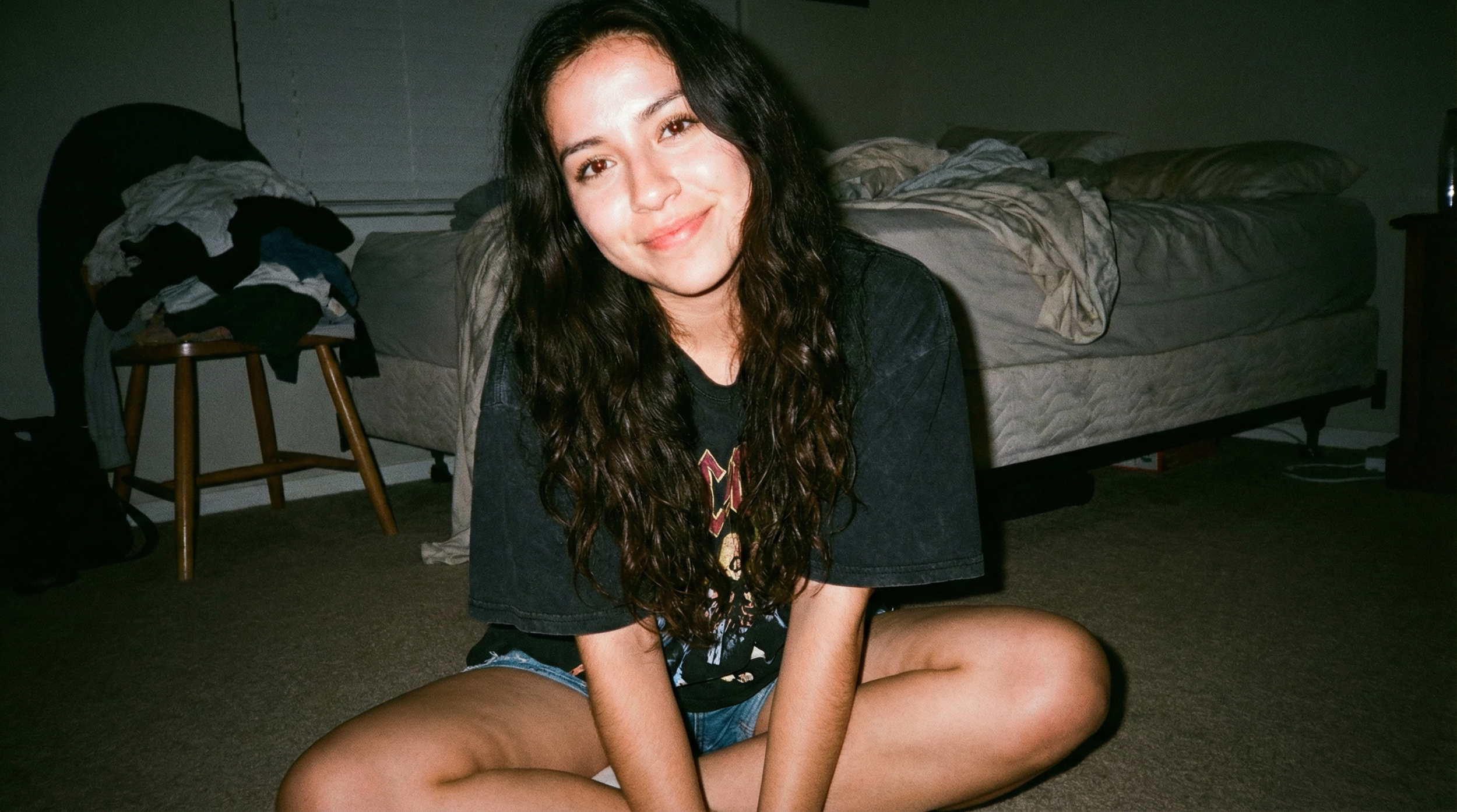 CAMERA / PHONE DETAILS: Shot on disposable camera, direct flash, On-camera flash harsh lighting, Visible grain, Slight red-eye effect, Overexposed highlights SUBJECT: 22 year old Latina woman, Long wavy dark hair, Minimal makeup, Relaxed expression OUTFIT: Oversized band t-shirt, Shorts, Barefoot POSE: Sitting cross-legged on bedroom floor, Looking directly at camera, Leaning slightly forward LOCATION: Bedroom at night, Messy bed in background, Clothes on chair, Flash illuminating subject sharply against darker room